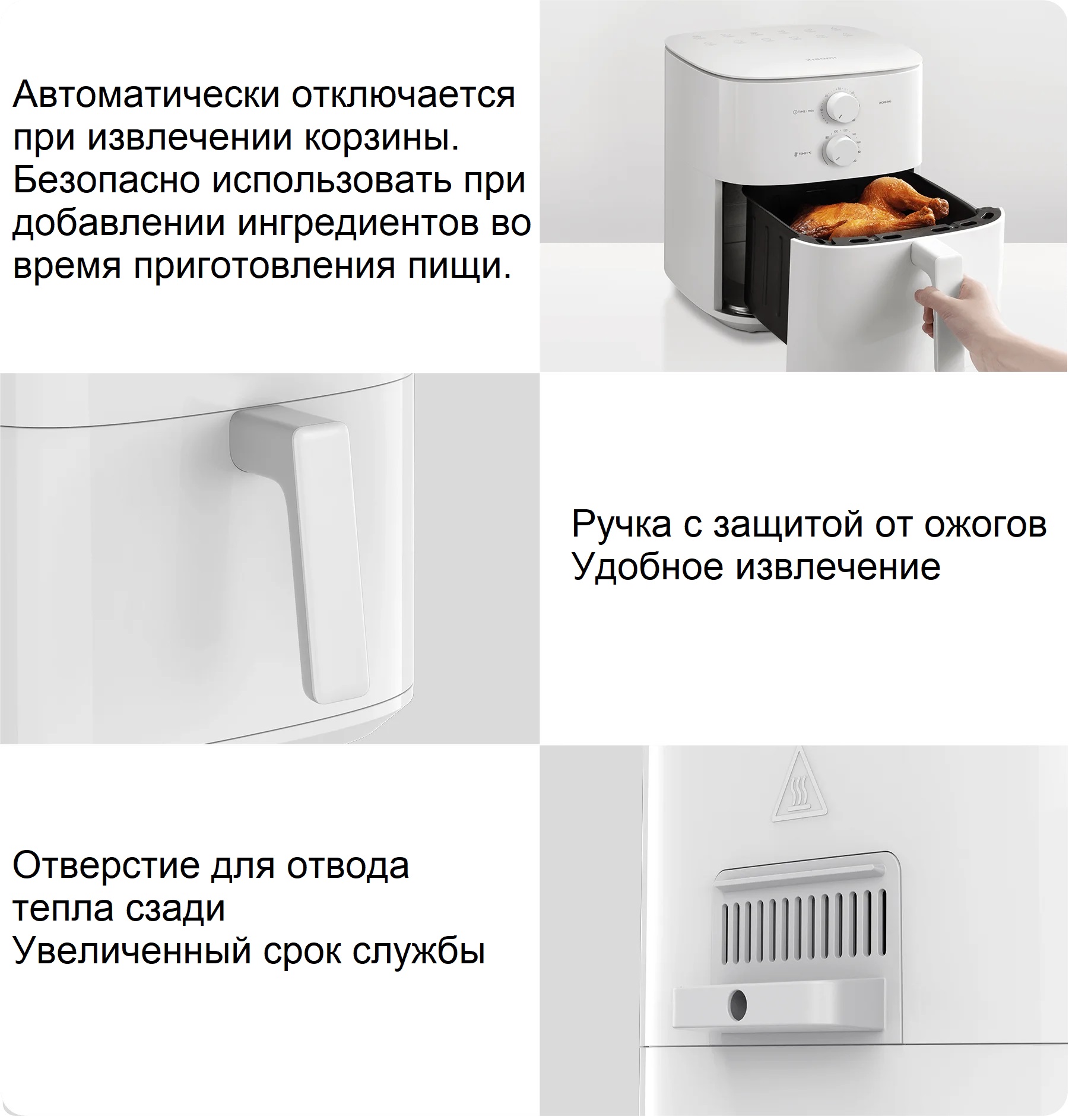 Мощный конвекционный нагрев 1550 Вт быстро удерживает влагу в пище и вытесняет жир, благодаря чему получается хрустящая корочка снаружи и нежная внутри.