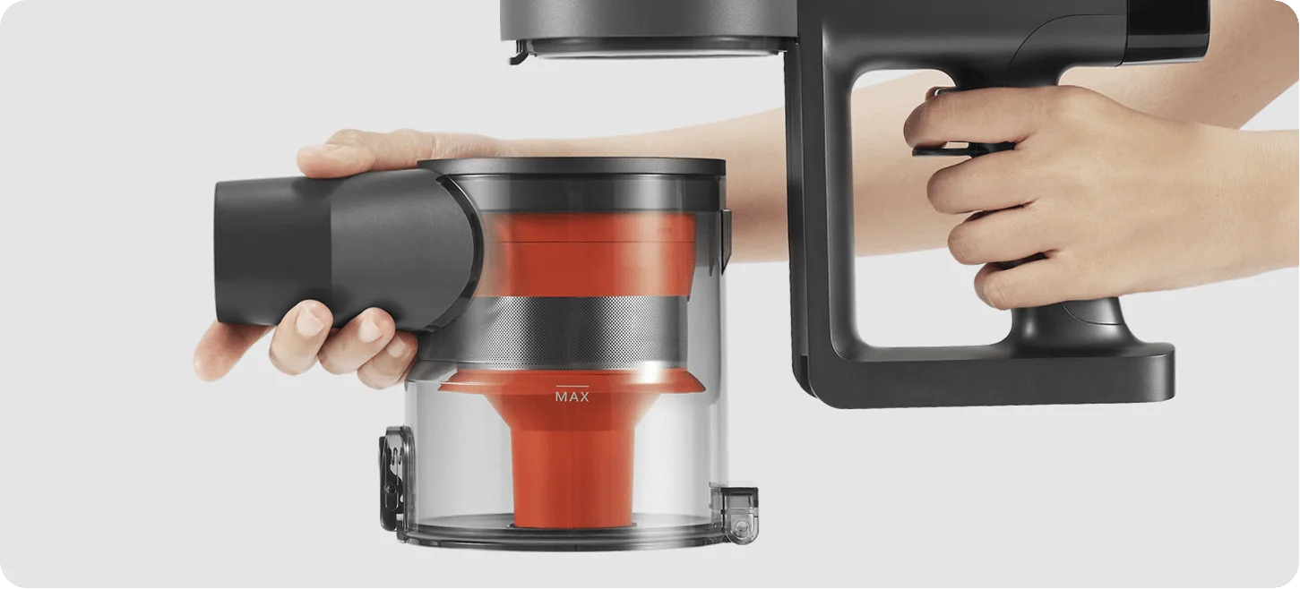 Пылесос оснащен контейнером для пыли объемом 600 мл, что уменьшает необходимость опорожнения во время уборки. Также, контейнер легко опорожняется нажатием всего одной кнопки, благодаря чему удобно удалять пыль и мусор и очищать отсек для пыли.