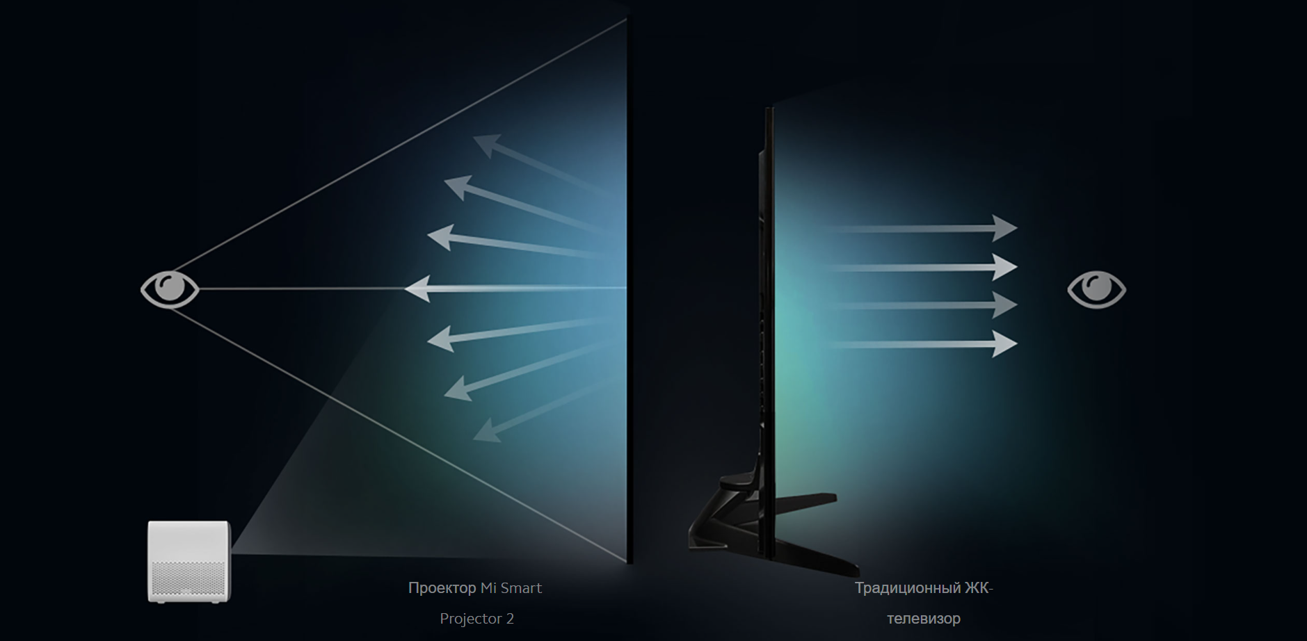 Рассеянное отражение света для комфорта ваших глазПортативный проектор Mi Smart Projector 2 использует рассеянное отражение. В отличие от традиционных ЖК-телевизоров, которые направляют лучи света непосредственно в глаза, рассеянное отражение оказывает меньше нагрузки на глаза и лучше подходит как для молодых, так и пожилых людей.