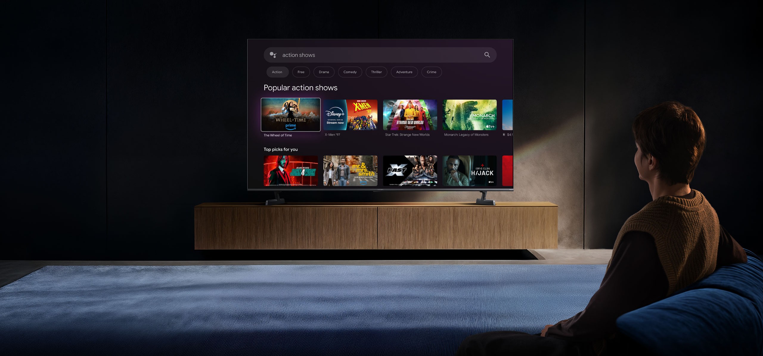 Телевизор поддерживает Dolby Vision, HDR10, HDR10+, HLG и режим Filmmaker. Система динамического управления подсветкой обеспечивает точное воспроизведение теней и светлых участков. Установлена операционная система Android TV 14, которая даёт доступ к приложениям, стриминговым сервисам и голосовому управлению.
