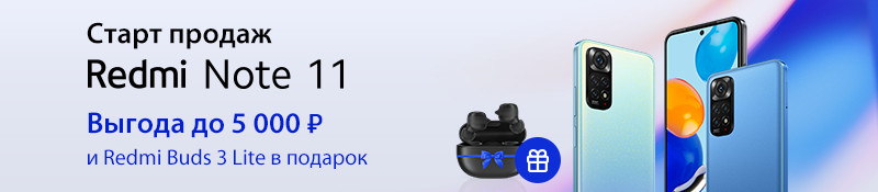 Приобретайте новый смартфон Redmi Note 11 с выгодой до 5 000 рублей в нашем магазине и вы получите в подарок беспроводные наушники Redmi Buds 3 lite! Акция действует с 21 по 31 марта.