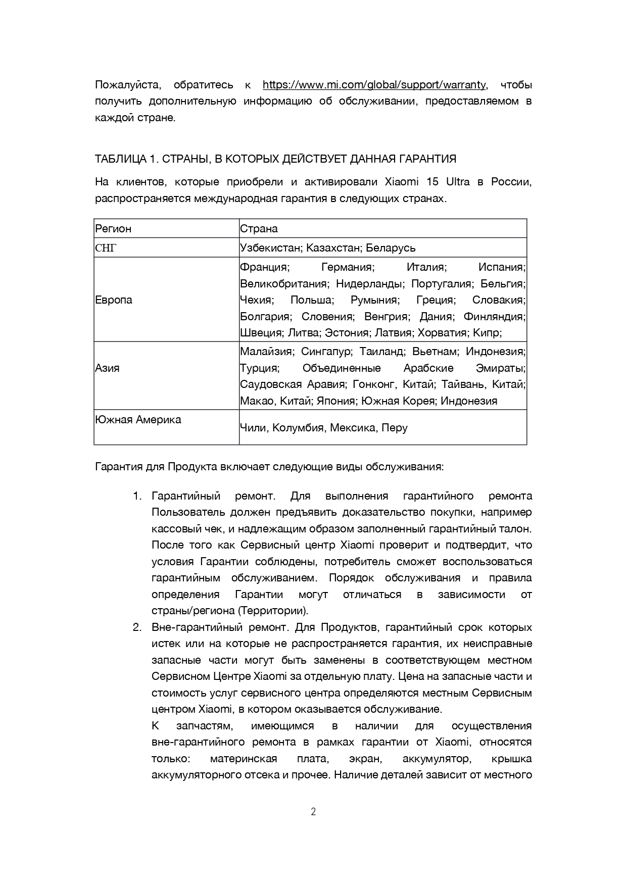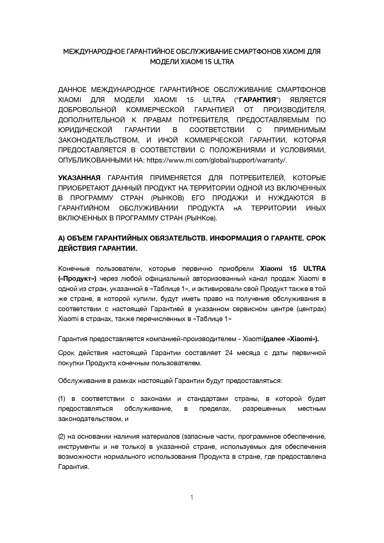 МЕЖДУНАРОДНОЕ ГАРАНТИЙНОЕ ОБСЛУЖИВАНИЕ СМАРТФОНОВ XIAOMI ДЛЯМОДЕЛИ XIAOMI 15 ULTRA