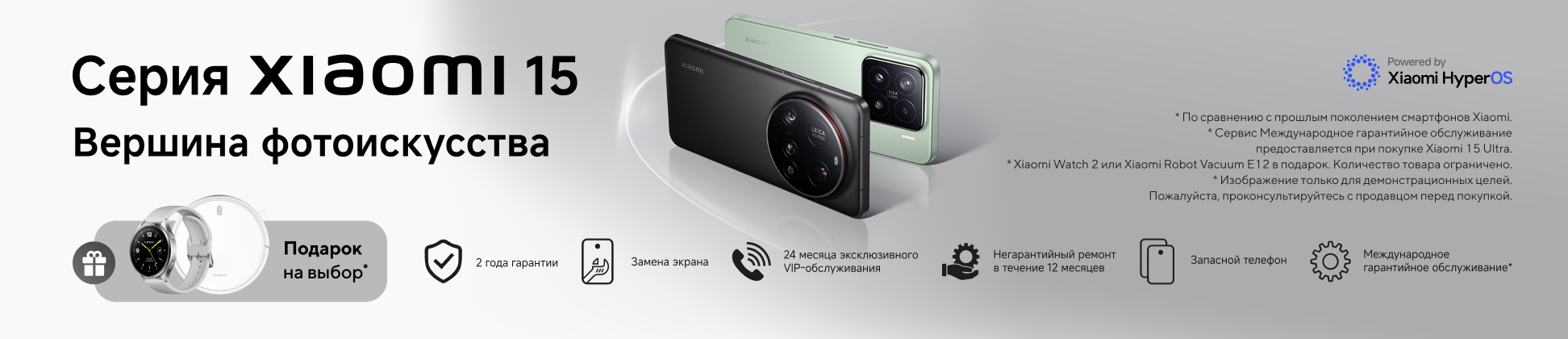При покупке  Xiaomi 15/15 Ultra с 3 по 31 марта — Xiaomi Watch 2 или робот-пылесос Xiaomi Robot Vacuum E12 в подарок на выбор!